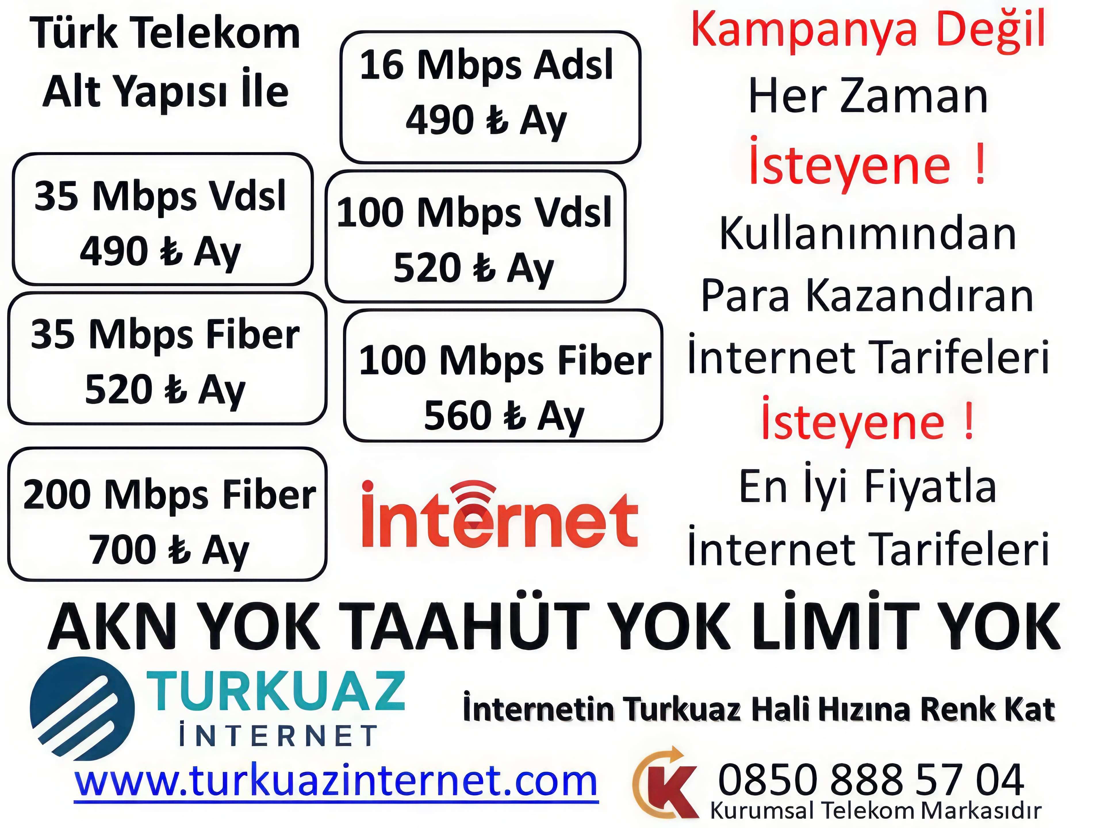 Turkuaz İnternet Türk Telekom Alt Yapısı İle Türkiye' nin 81 İl ve İlçesinde ADSL, VDSL, Fiber İnternet Hizmeti Sağlamaktadır. Kullanımıdan Para Kazandıran İnternet Tarifeleri Vardır. Turkuaz İnternet Kurumsal Telekom Markasıdır